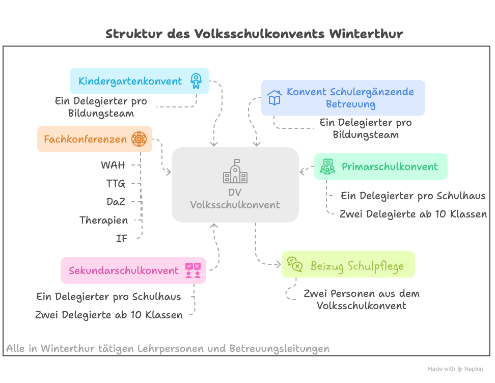 Zum Volksschulkonvent (VSK) gehören alle in Winterthur an der Volksschule unterrichtenden Lehrpersonen mit den Betreuungsleitungen.